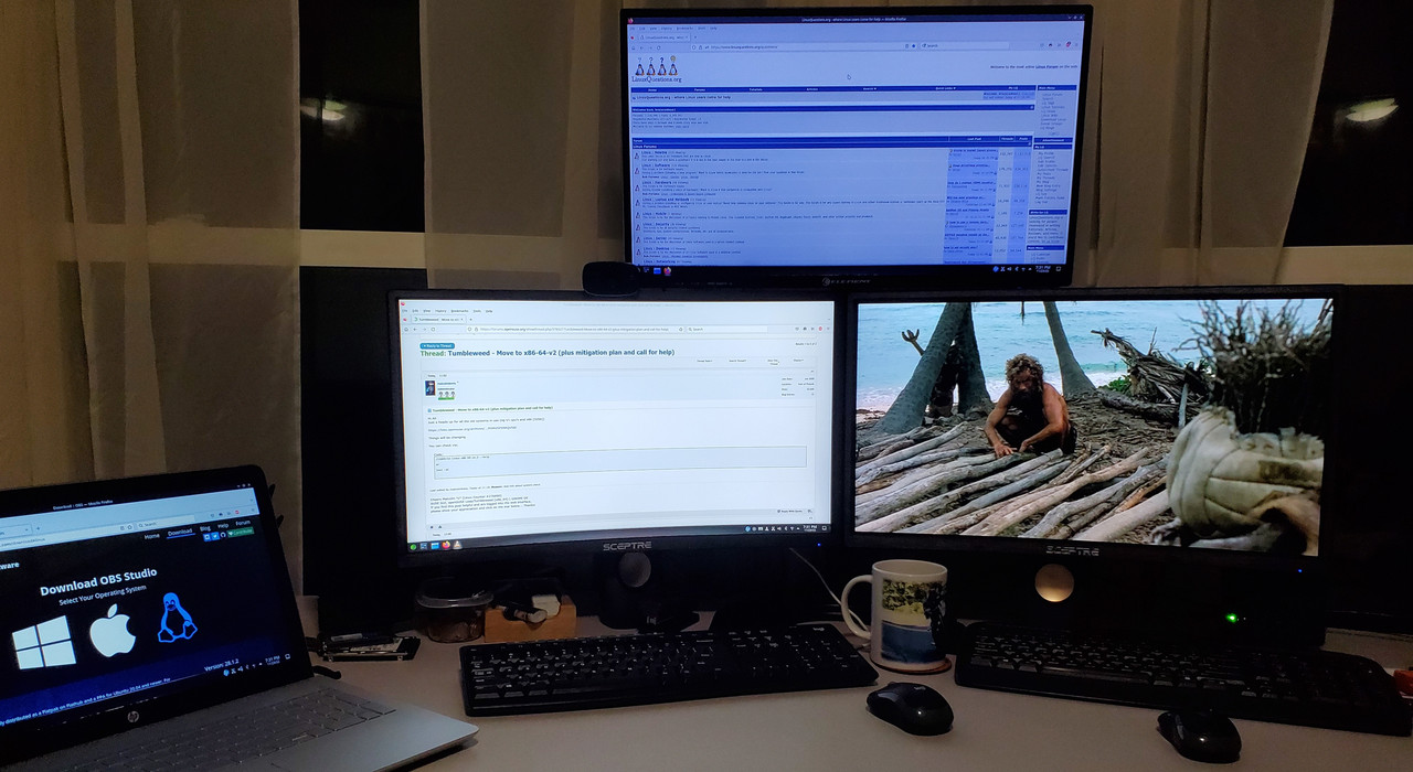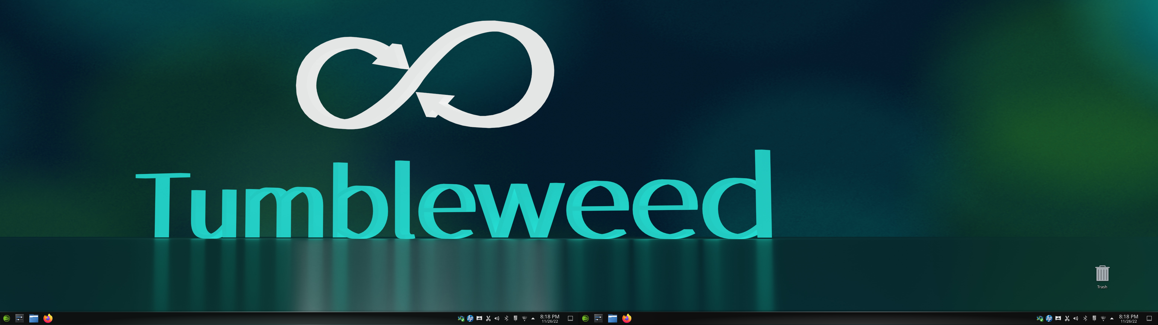 Not really a screenshot, but a pic of my current desk. Three computers all running Tumbleweed. Dual monitors a cheap HP desktop, the top monitor is a mini pc running as a file server, and plex server, and a few other network services. And of couse the laptop on the left. All run incredibly well, and fast. I just got back to openSUSE after many years away, and am very happy with everything!