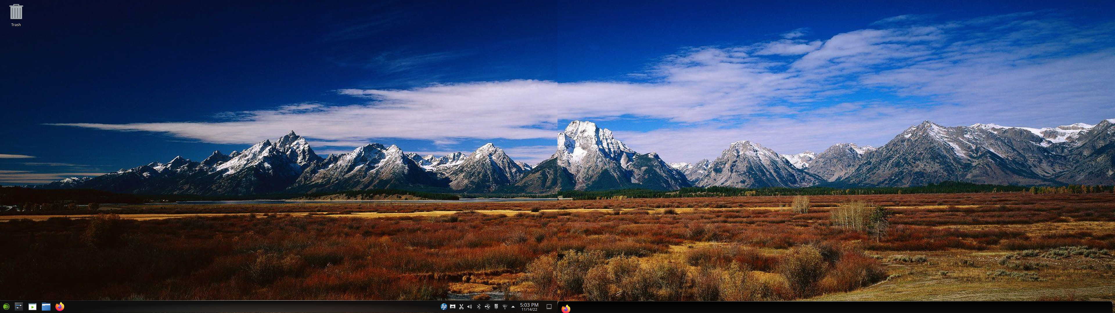 Dual monitors using Superpaper for one wallpaper spanning two monitors.