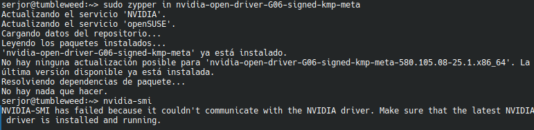 I tried the commands zypper -vvv dup zypper dup, zypper in -f nvidia-open-driver... but no luck, the driver is not working