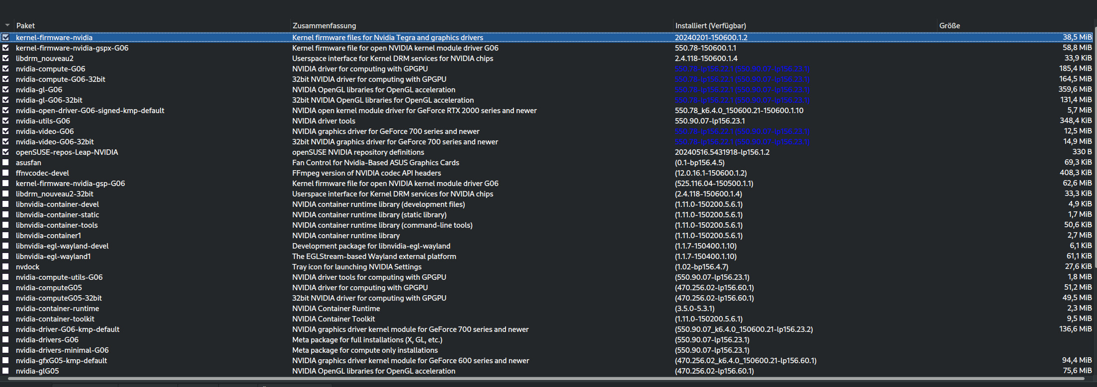 Yast: Der offene Treiber (nvidia-open-driver-G06-signed-kmp-default) ist lediglich in Version 550.78 verfügbar, alle anderen Nvidia-Pakete sind in Version 550.90 verfügbar. Ich konnte die restlichen Nvidia-Pakete nicht auf V550.90 aktualisieren, siehe Nachricht weiter oben, weil der offene Treiber mit seiner alten Version 550.78 blockiert hat. Yast hat mir den Konflikt angezeigt und mir empfohlen entweder den offenen oder den closed source Treiber in Version 550.90 bereitzustellen, um dann auch die restlichen Nvidia-Treiber auf die neuste Version 550.90 aktualisieren zu dürfen