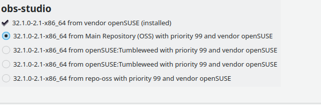 I am not sure if I understand you, but OBS-studio is straight forwardly available from the main repository. And⌠I have the repo-openh264.repo loaded and active as well (although I am not sure obs_x264 and h264 are part of my problem, dont knowâŚ)