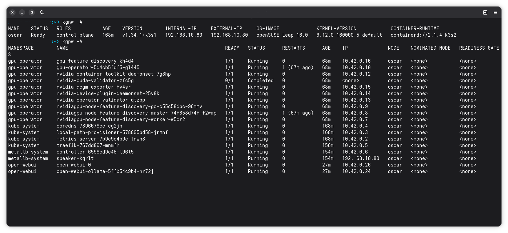 A little different screen shot, this is my current WIP with Leap 16.0, k3s and Ollama on open-webui;