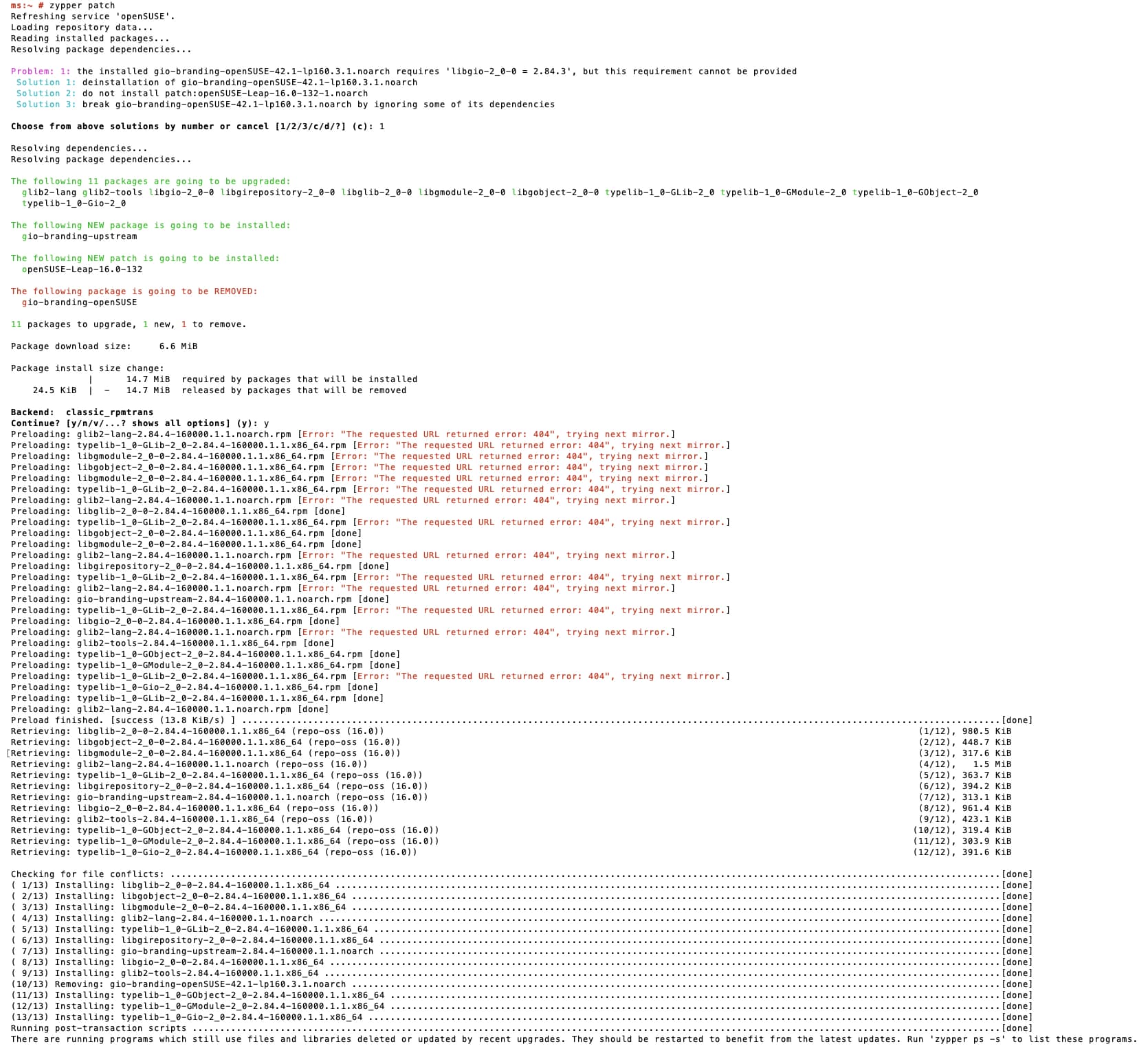 the installed gio-branding-openSUSE-42.1-lp160.3.1.noarch requires 'libgio-2_0-0 = 2.84.3', but this requirement cannot be provided