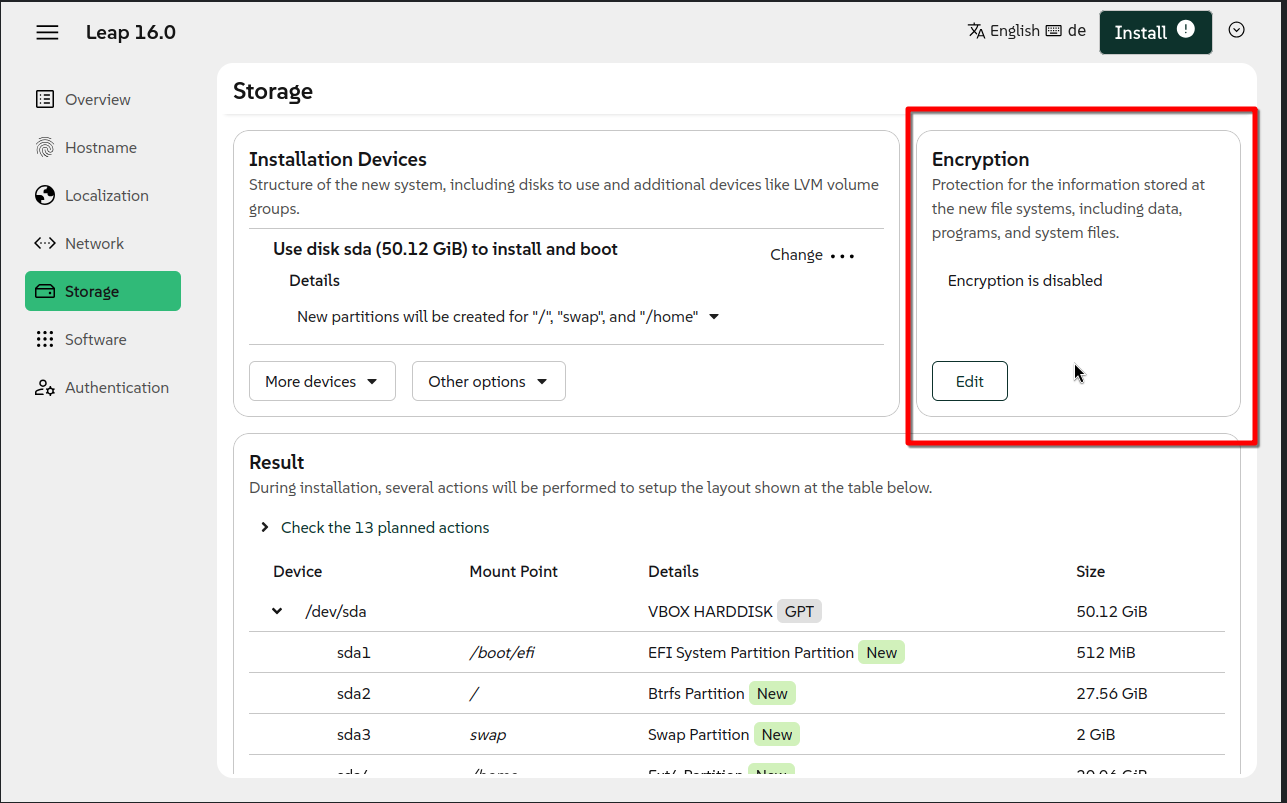 But I have failed each and every time I’ve tried to accomplish such a setup using Agama’s interface as shown here. For the moment I am stuck with Leap 16 with btrfs on / and XFS on /home, but none of the partitions are encrypted.