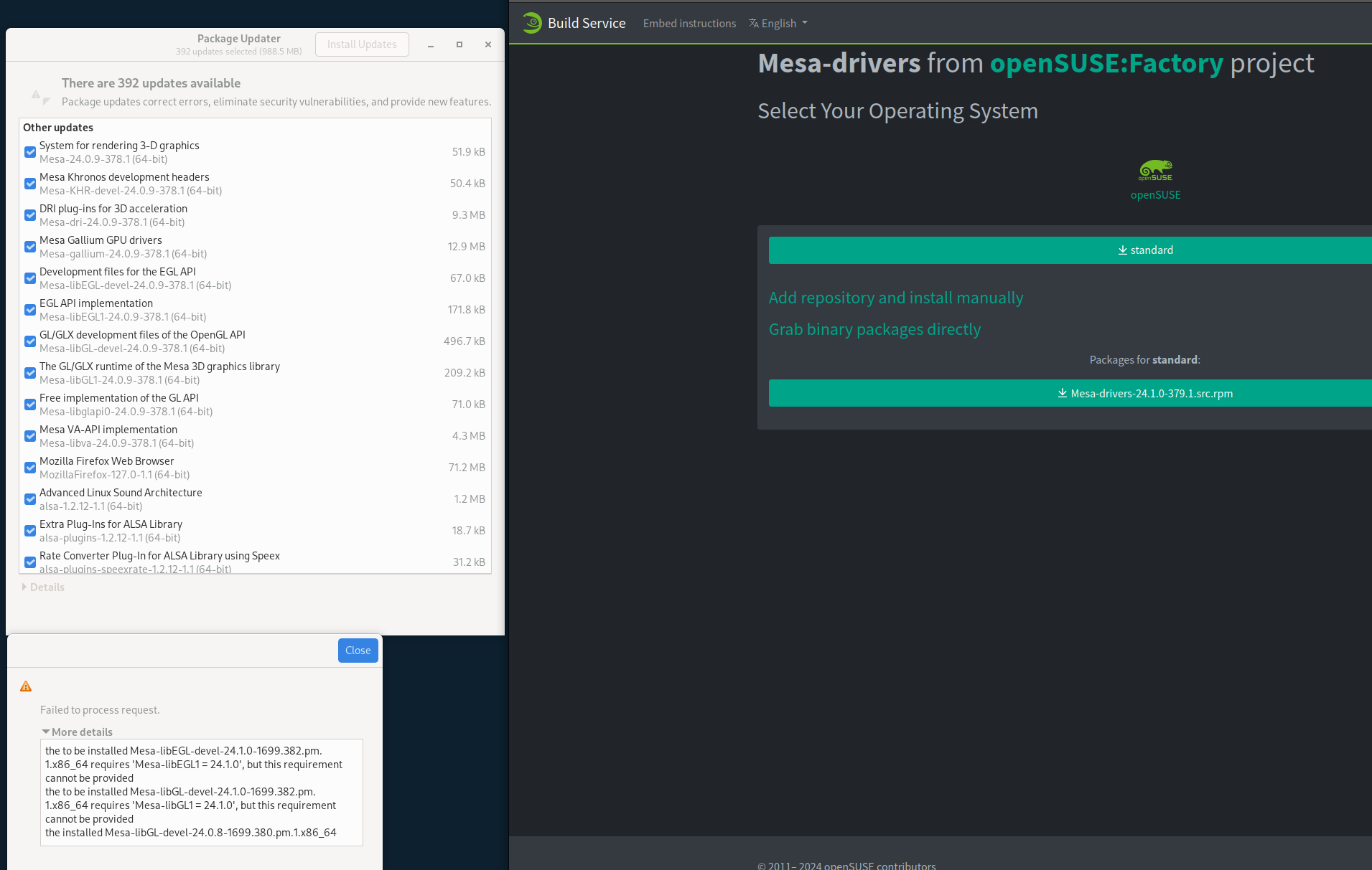 Hi thanks for the update. I’ve tried re-booting but the issue remains. It looks like it’s trying to install some 24.09 updates (see picture of update list 2nd & 4th item). But the error message below talks about 24.1, so I’m not sure what’s going on or if there is some kind of conflict? Looked up the Mesa drivers (see right of picture) but not sure if I should download those directly or add their repo? Frustrating thing is I don’t think I even need Mesa stuff as I don’t really use 3-d graphics as I’m not a gamer. Or could be because I have a Nvidia Graphics card maybe (running under x-11 as it behaves better than under Wayland) ?