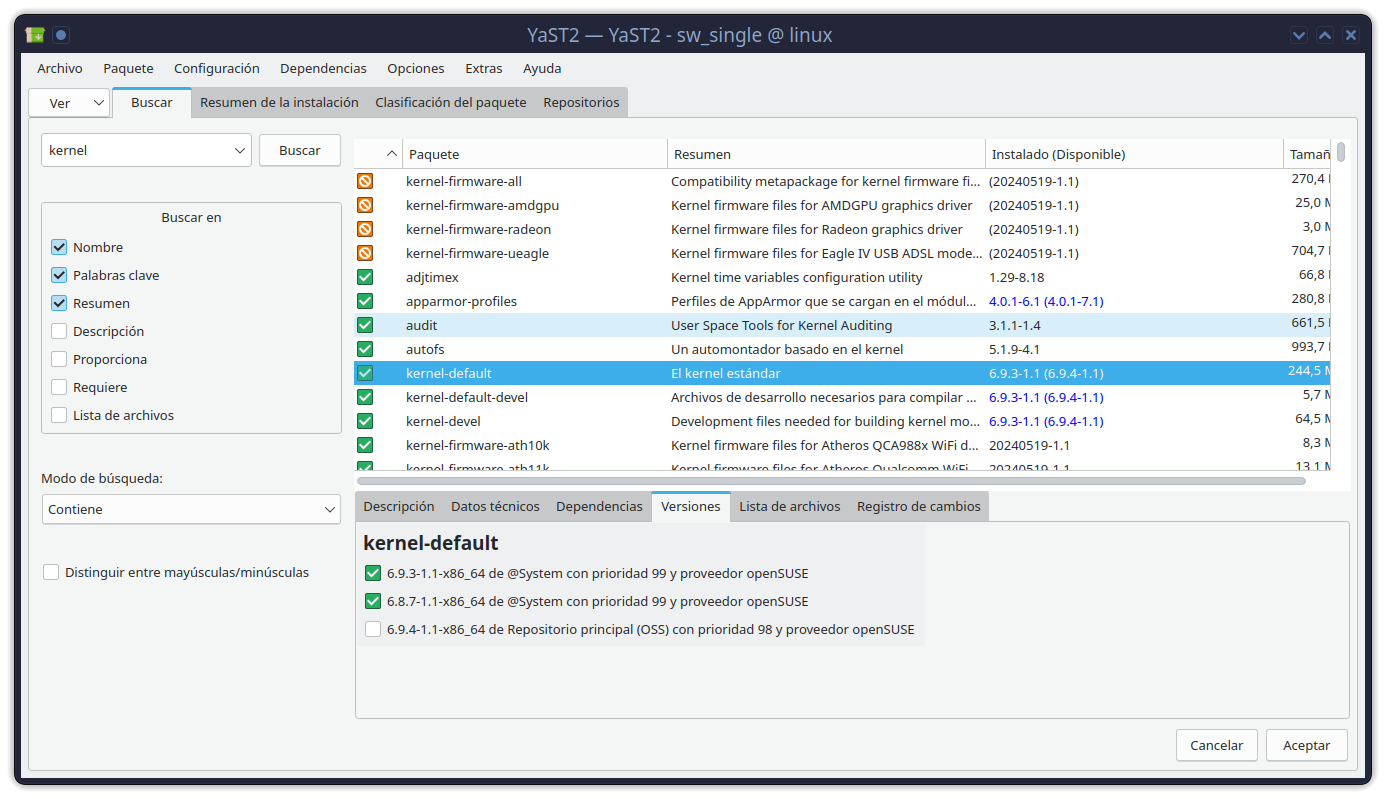 Imagino que podrás desde Yast desde la pestaña de Versiones. Ejemplo con kernel-default: