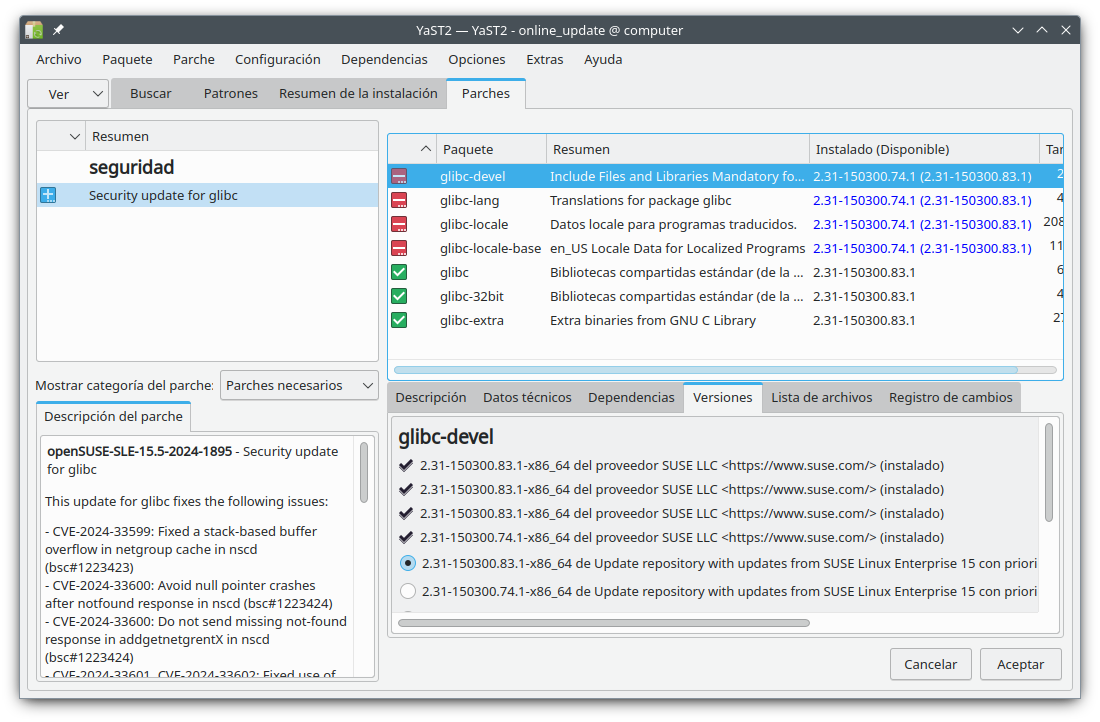 Desde hace un par de días en una portátil se da un problema extraño que en la otra no ha sucedido. Tanto el applet de actualización como la actualización en línea de YaST2 dicen que hay una actualización de seguridad para glibc, pero al intentar instalarla da error.
