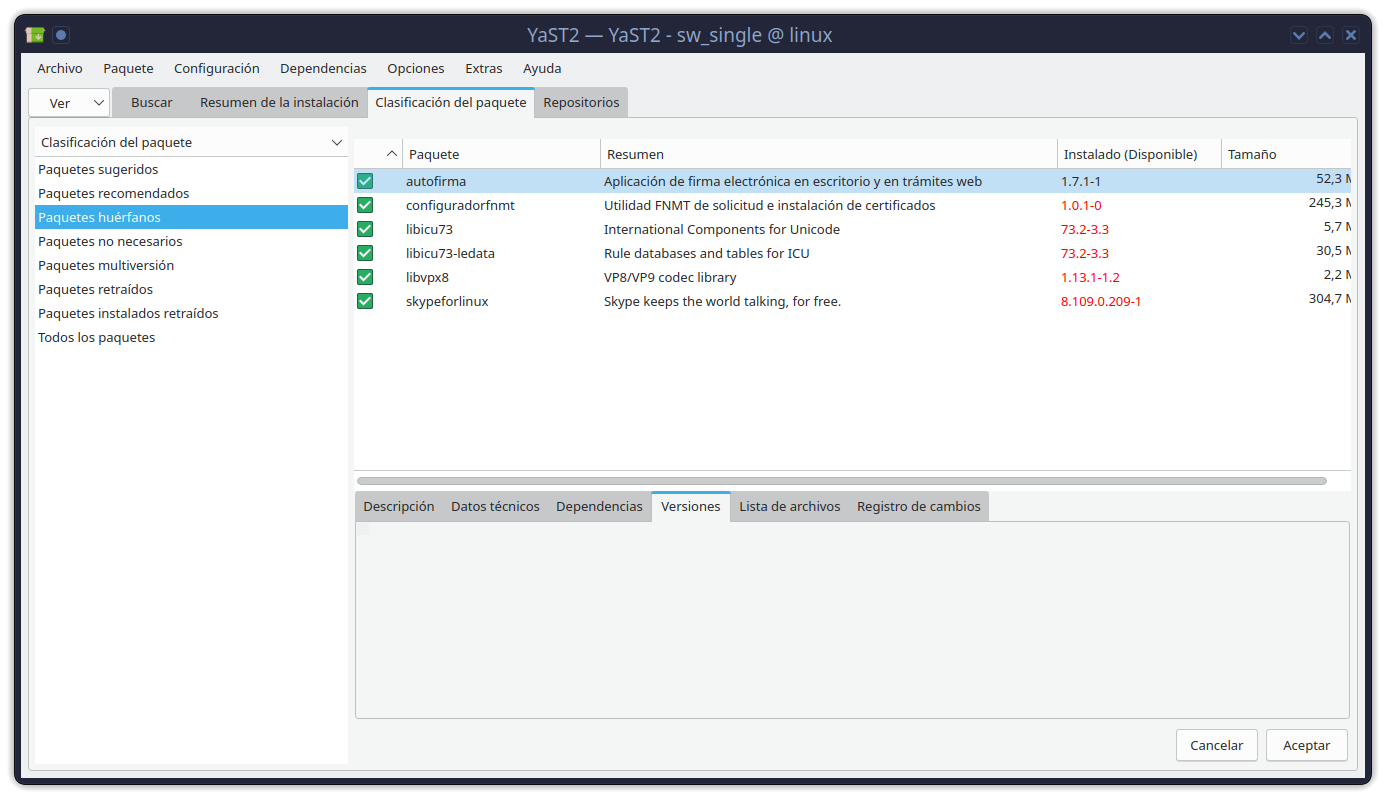 Puestos a probar cosas, toqué la versión 74.1 y luego otra vez la versión 83.1, con lo que la marca roja pasó a la marca verde, le di a Aceptar… y el sistema me dice que la versión 74.1 no está instalada… no tengo idea de qué esté pasando. ¿Estará arruinada la base de datos de rpm?