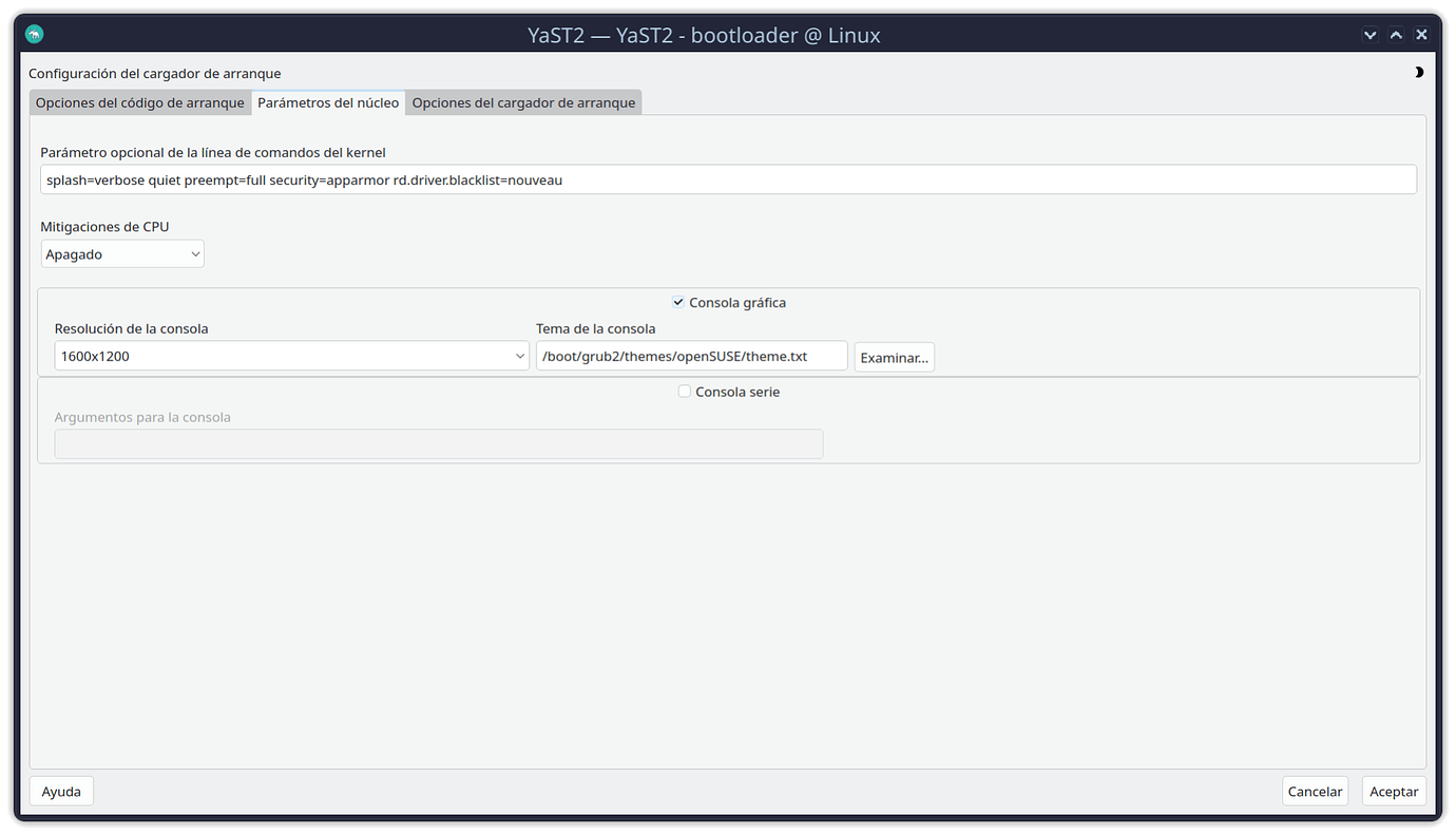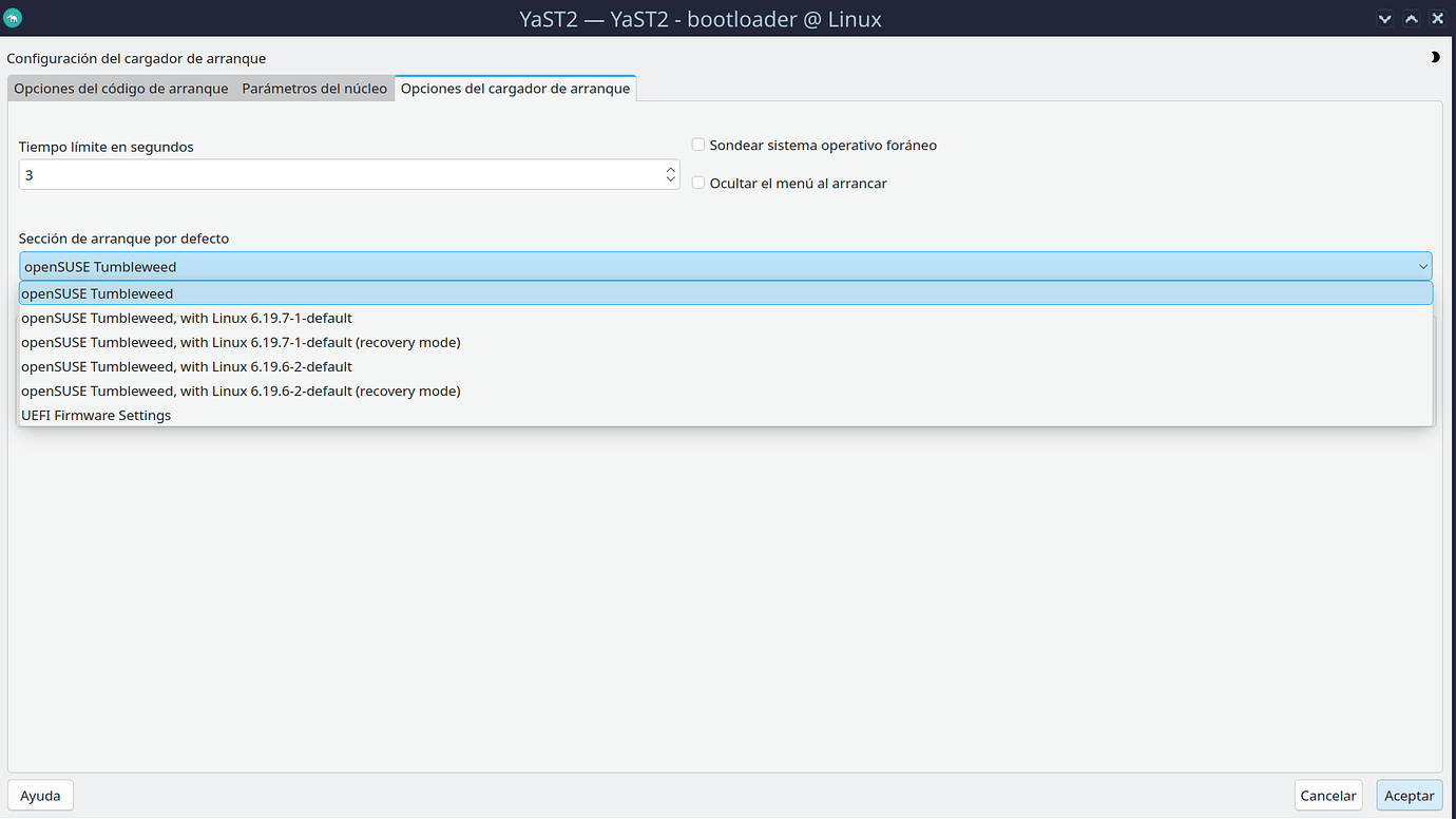 La 2ª línea era un menú Advanced options for openSUSE Tumbleweed y al darle te salían las 4 opciones que se ven en mi captura del gestor de arranque de Yast de más arriba: