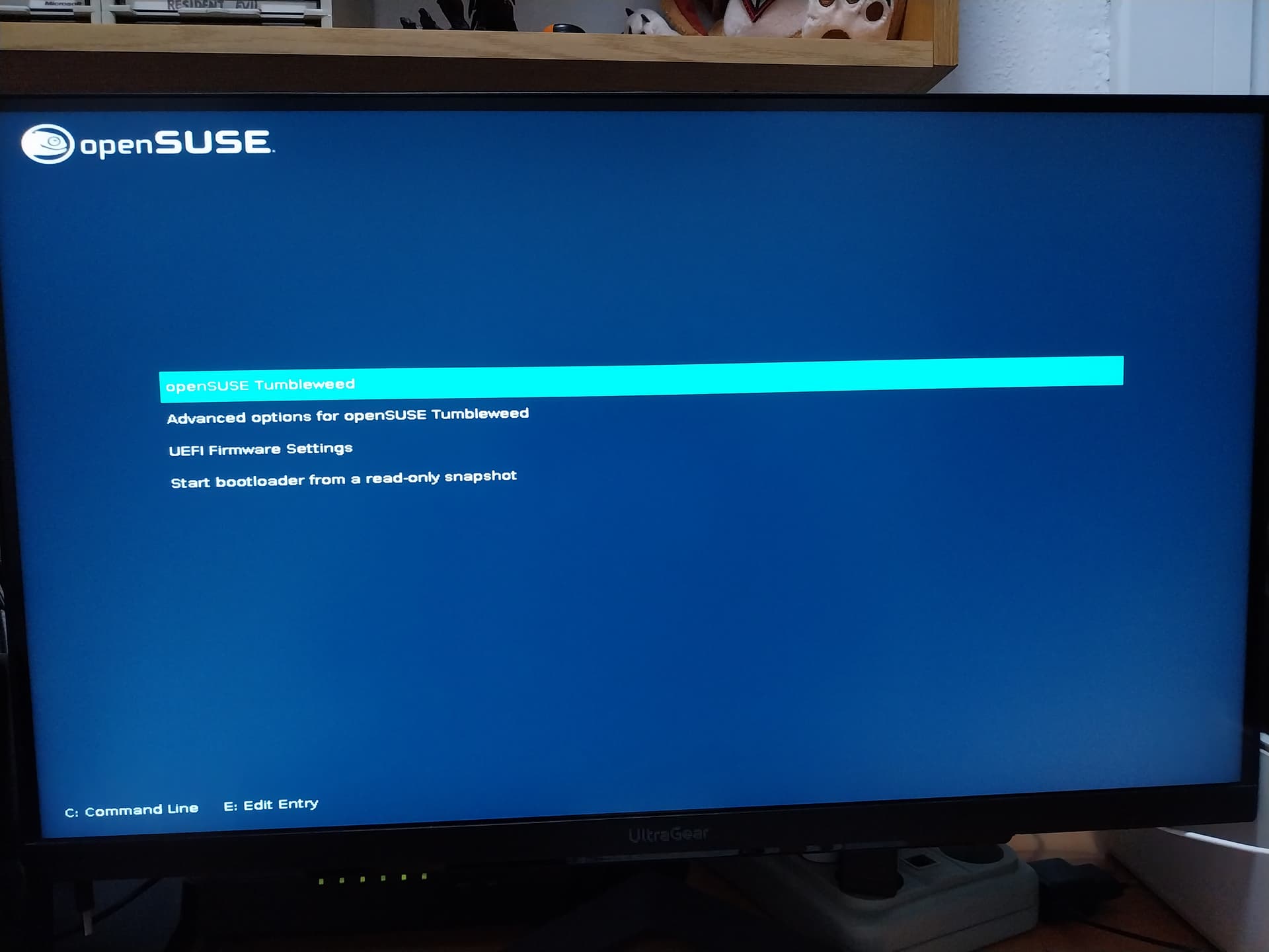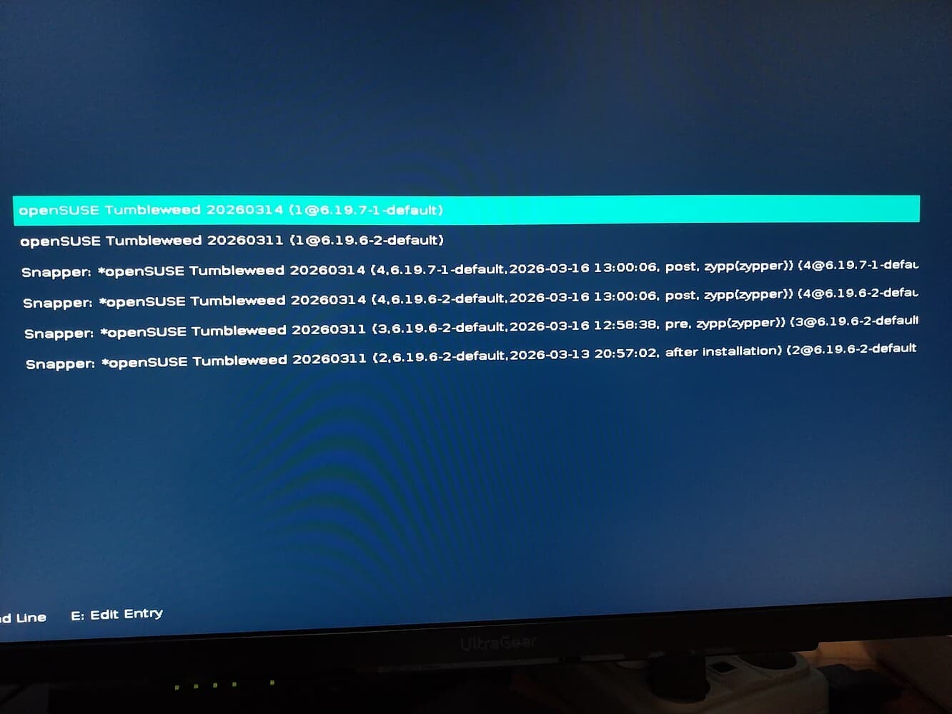 Hola. No se si es posible tecnicamente pero creo que Tumbleweed ha cambiado a systemd-boot como gestor de arranque por defecto y esa captura que has puesto es muy similar a mi gestor de arranque (systemd-boot) solo que a mi me aparece sin color. ¿Puedes verificar si el sistema usa grub2-efi o systemd-boot?