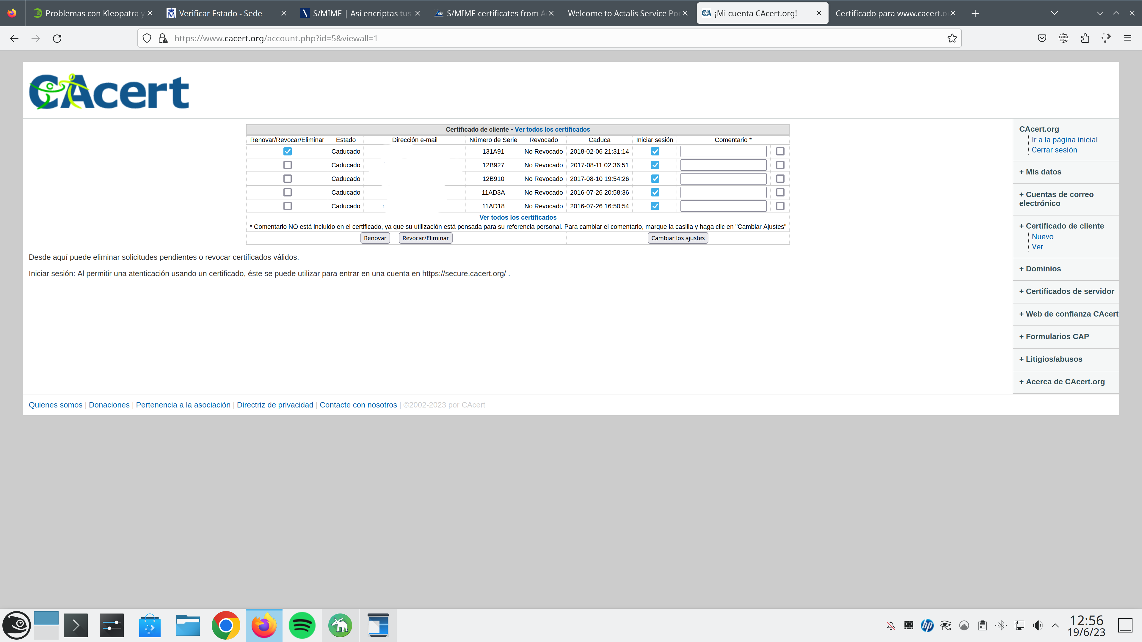 Pero intento mentalizar a algunos clientes en determinados buenos hábitos, y quería que el de usar herramientas de firma y demás fuera uno de ellos. Pero algunos tienen sus certificados expedidos antes de tener sus dominios y por ende de sus cuentas de correo. Así que tendré que convencerles de que los cambien y tendrán que ir presencialmente.