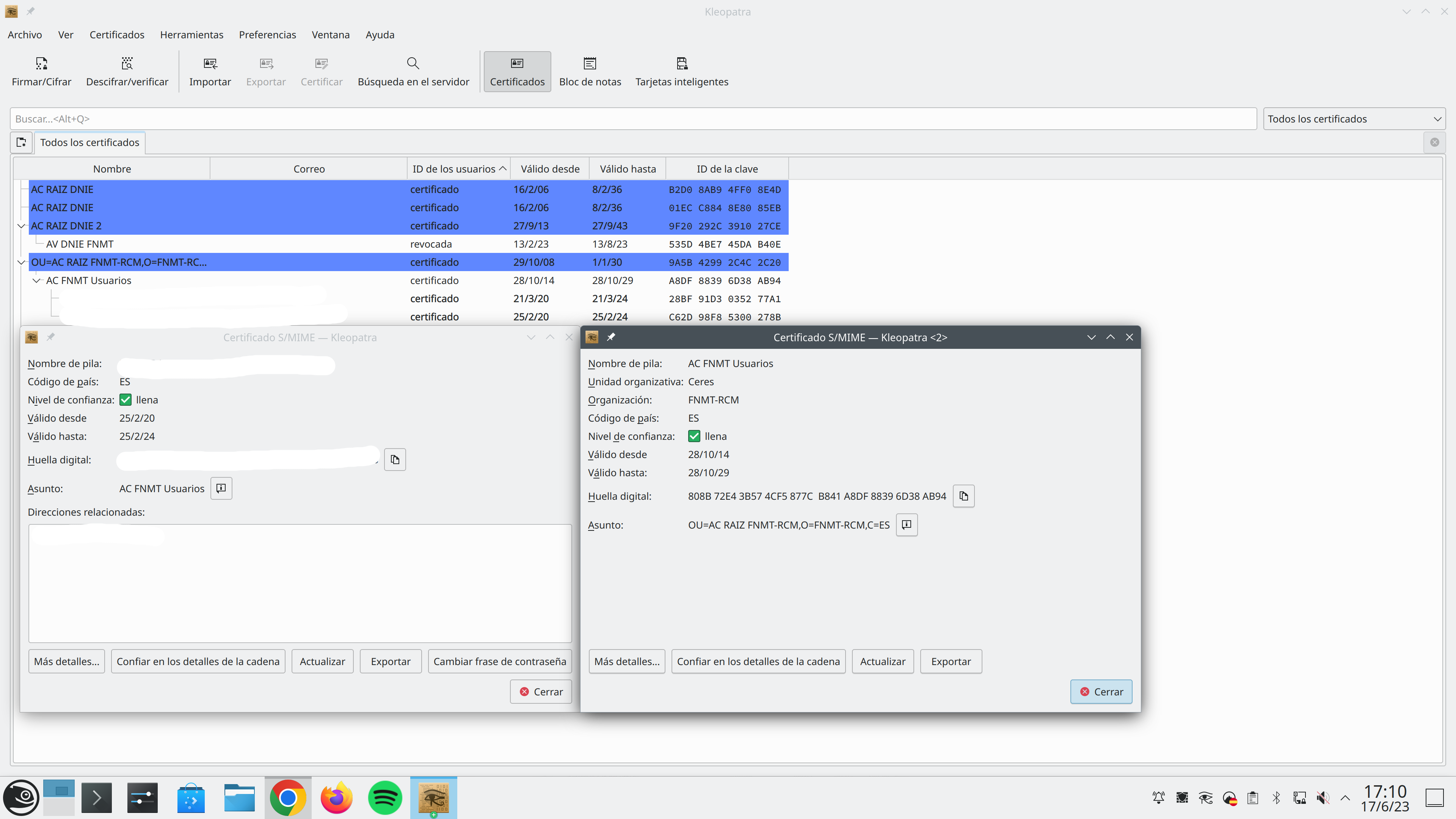 Pero si no recuerdo mal (hace ya tiempo), una vez cargado los certificados en kleopatra , señalas el certificado y tienes que ir a la pestaña de certificados y validarlo.