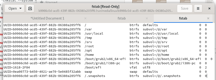 Heb je die wel gemount op je live systeem? Of is die onderdeel van je root (kennelijk Btrfs) file syseem?