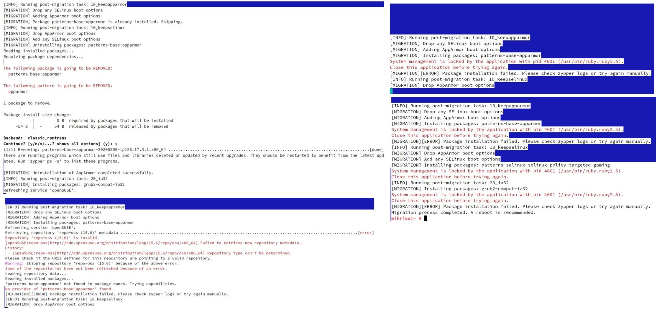 Otra es por falta de alguna aplicación de la herramienta de migración .Ejemplo selinux, apparmor y ia32 (las que se selecciona en el menú de la herramienta .