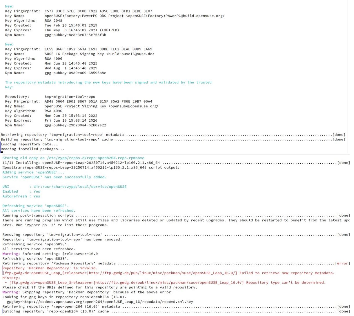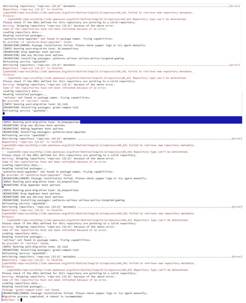 En cuanto los repositorios, si no los encuentran o fallan, la aplicación salta y continua con la migración: En caso de fallo de esta herramienta a mi me quedo la 15.6 sin modificaciones (por lo menos no tuve riesgo al ejecutar, al reinicio el sistema estaba como al principio) .