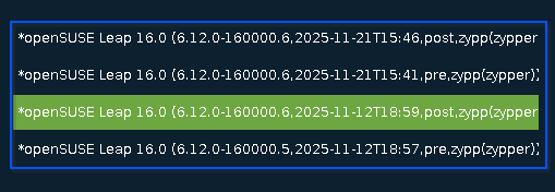 Is there any way to have the BTRFS snapshots show in grub in their own menu? Mine just fill up the main grub menu “like extra kernels” I would like an option like boot to read only snapshot option that goes to another menu that shows nothing but the snapshots. If I remember correctly this is how Leap does it.