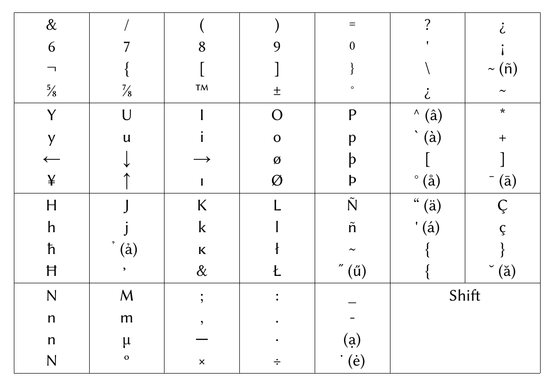 Recordé que hace ya unos cuantos años, cuando el blog era joven y yo un poco menos viejo, había escrito una serie de artículos sobre el mito del teclado perfecto (Primera parte, Segunda parte, Tercera parte) por lo que edité el último para agregar el PDF con las tablas que mostré más arriba. Como digo por allí estoy utilizando el teclado español «a secas», no uno de los específicos.