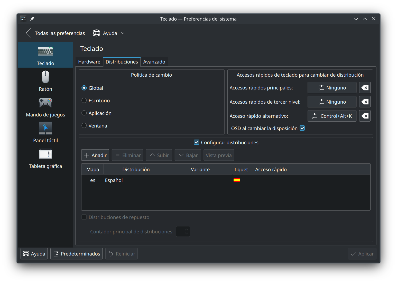 En Plasma 6.4.4 puedo seleccionar entre seis teclados españoles, un teclado asturiano (¡!) y un teclado catalán, y luego cinco teclados español latinoamericano. Tendré que reservar algo de tiempo este fin de semana para experimentar.