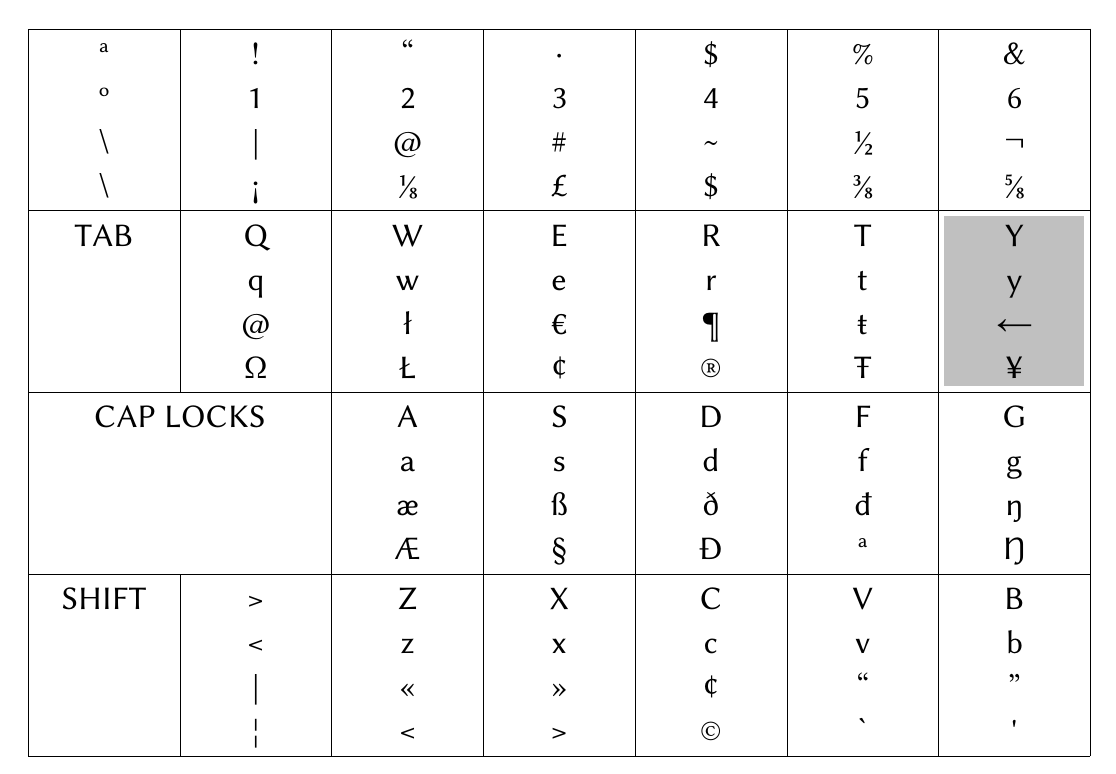 El foro no me deja subir PDF, por lo que pongo dos imágenes, una para la mitad izquierda y otra para la de la derecha del teclado. Cada celda de las tablas representa una tecla del teclado español con el resultado de usar esa tecla