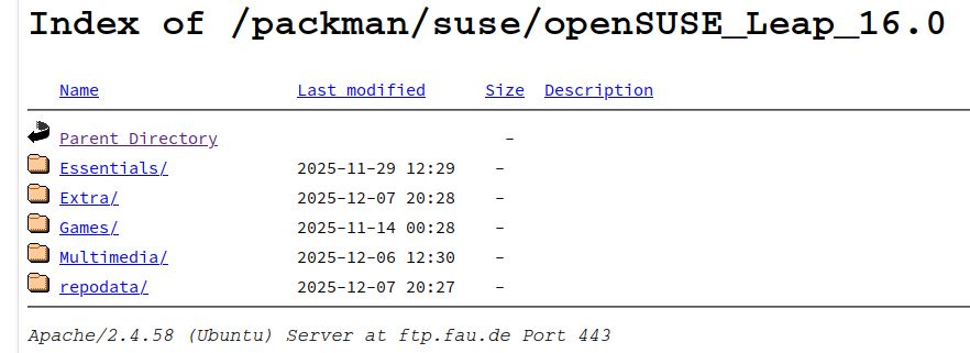 14 | packmansuseopenSUSE_Leap_16.0                | packman/suse/openSUSE_Leap_16.0/                             | Yes     | (r ) Yes  | Yes     |   77