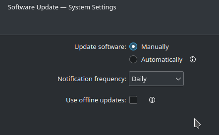 So, I guess I’m gonna have to pour over the Kalpa documentation to learn how to change the settings for the ‘automatic update’ , i.e., to change the time to check, frequency of re-checks, and turn off the ‘power cord’ requirement.
