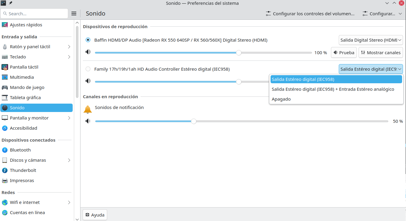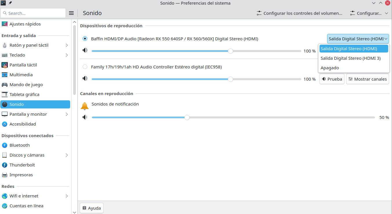 El tema es que ayer hice una actualización a mano ya que discover no podía resolver uno de los paquetes de Mesa que venía de 2 repositorios con versiones diferentes (uno de packman si no estoy mal y el otro del principal de openSUSE), eligiendo yo a mano el de este último. El audio va (o iba por el problema) desde la tarjeta gráfica (Radeon RX550) al monitor con altavoces por el puerto dPort.