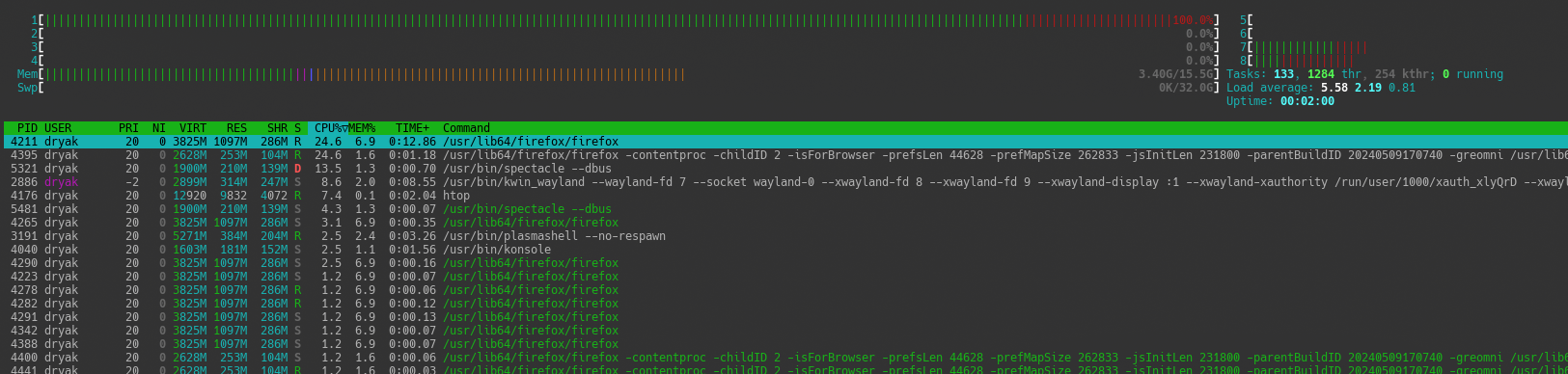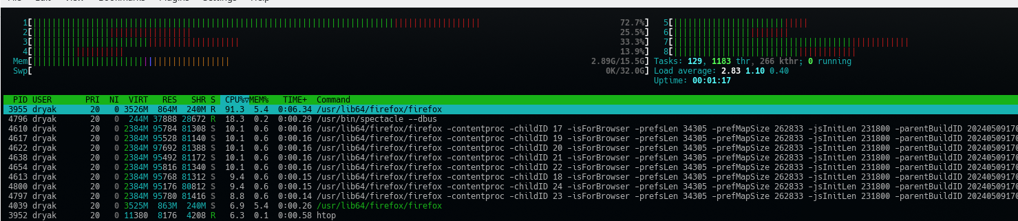 htop while firefox loads with previous kernel 6.8.9: