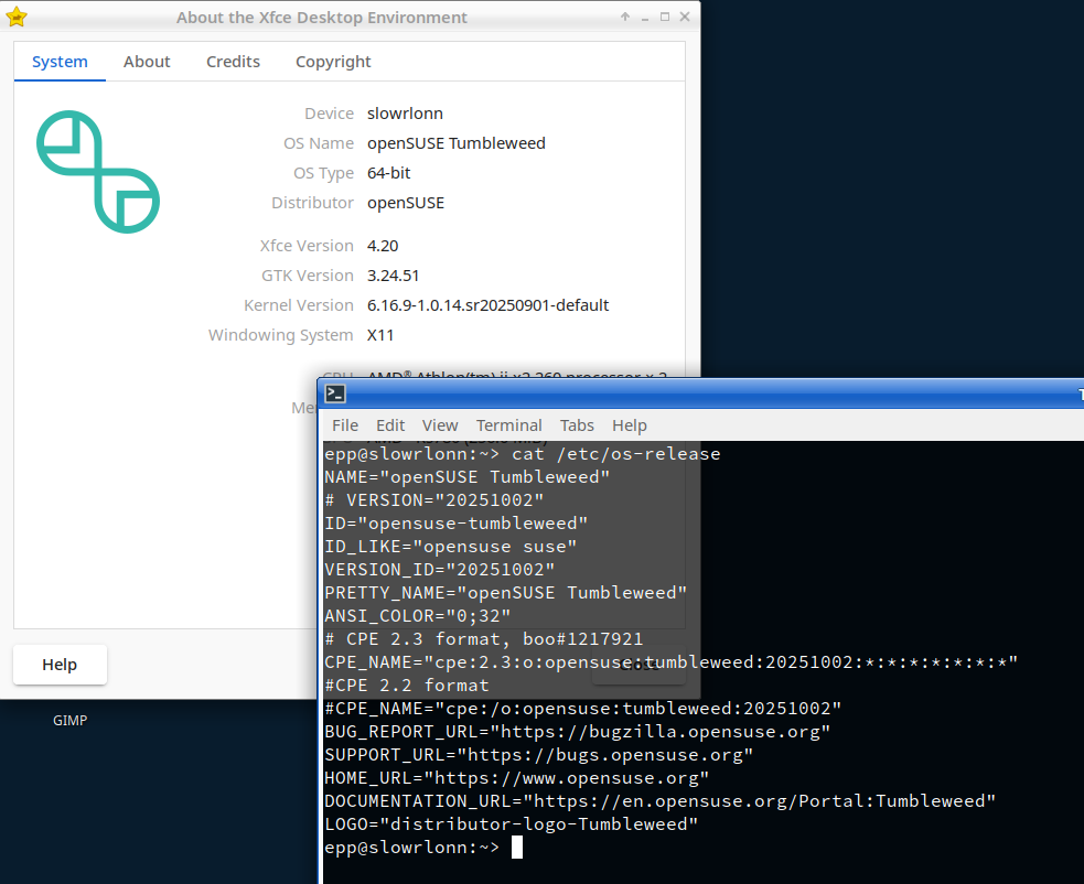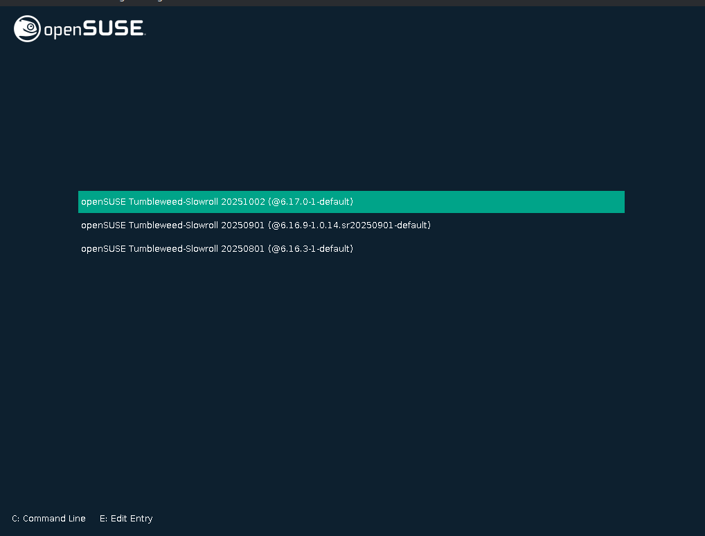 cat /etc/os-release now shows Tumbleweed with a 2 October date. The only place where I see any reference to Slowroll, aside from the repositories, is the Plymouth boot splash screen and in the previous kernel (info in the image below referencing sr20250901).