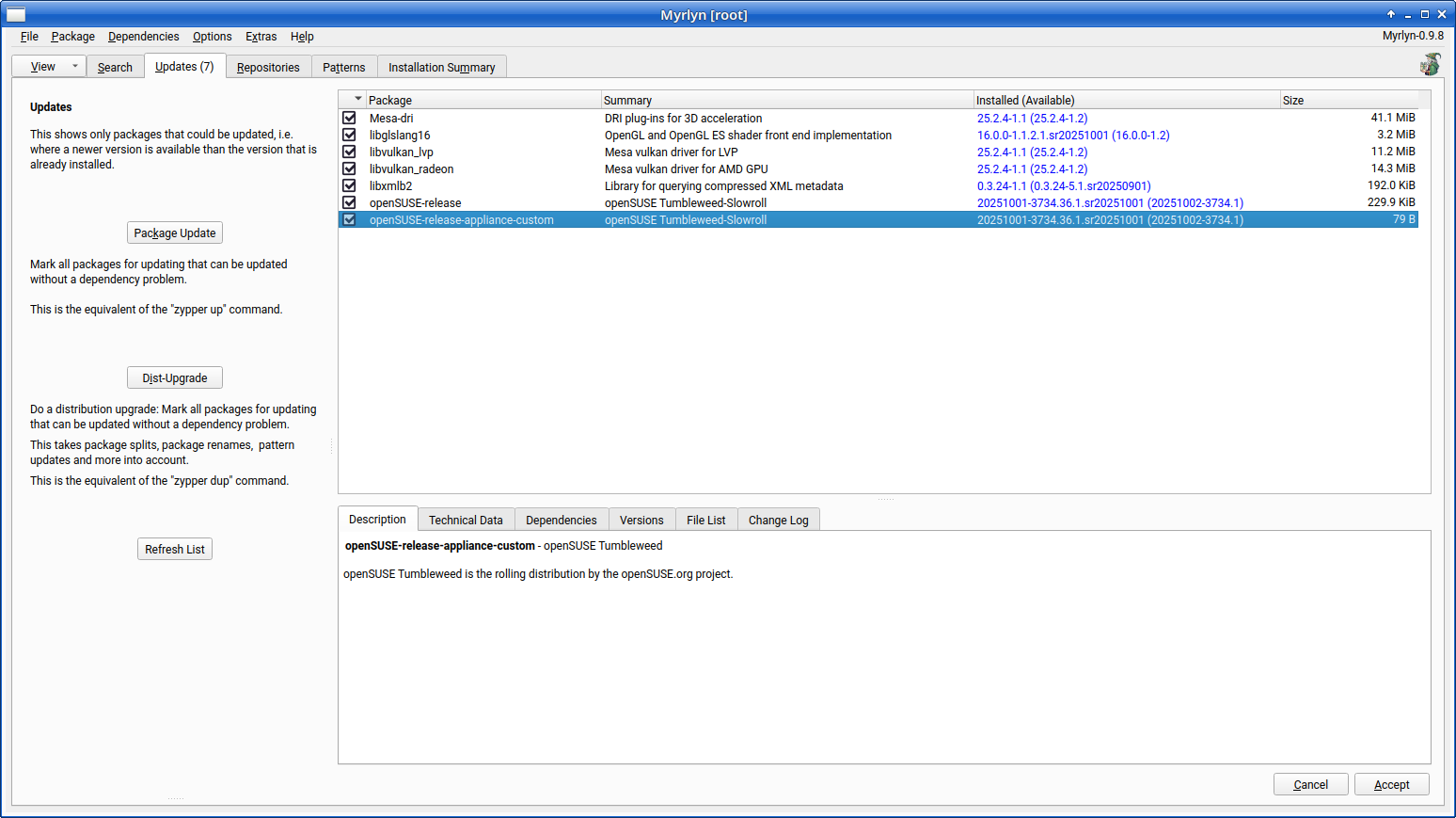 The system (except for the GRUB menu) after a reboot, now correctly identifies as Slowroll, however when I ran Myrlyn again, it now wants to update the above two packages to the incorrect Tumbleweed package version, which is not in the repo per the above check through the web browser.