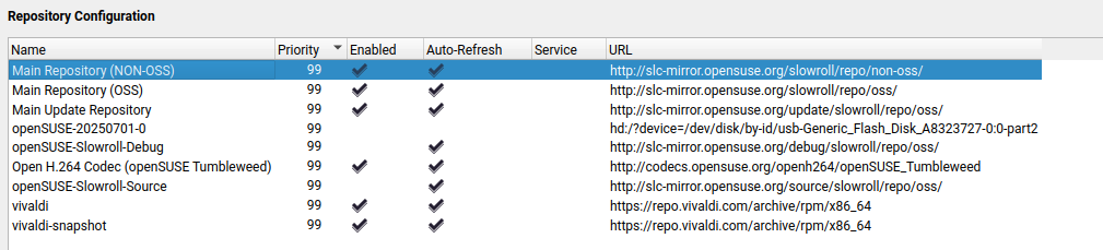 When running zypper afterwards, it now wants to downgrade 13 packages to the packages in the Slowroll repo, however it also references the two openSUSE-release packages referencing Tumbleweed 20051002 not to be installed and a product update also referencing the same, so there is still something wrong.