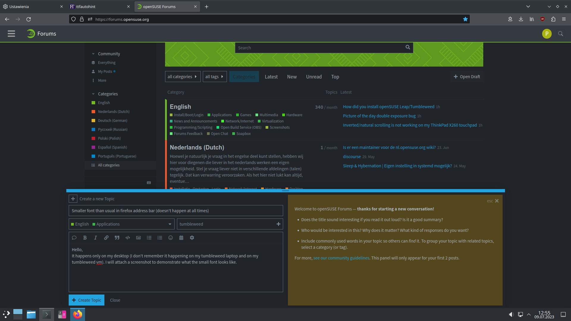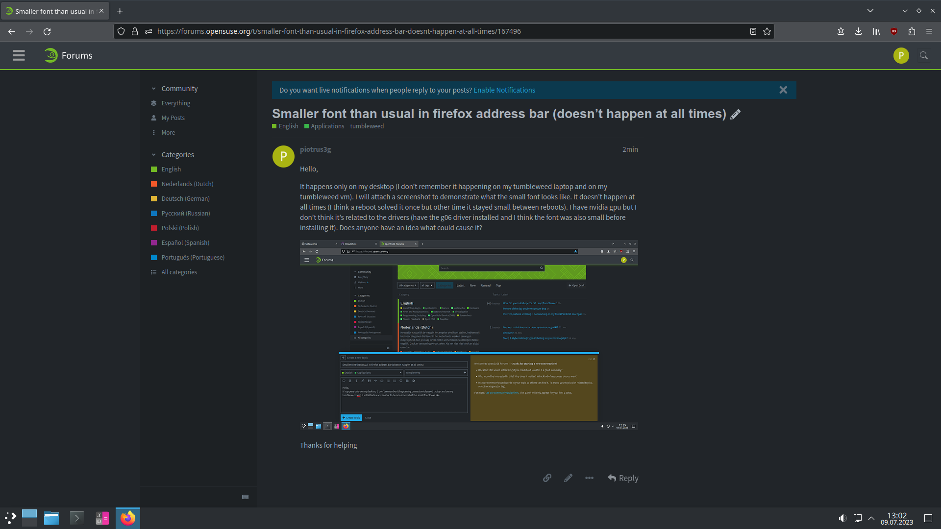 It happens only on my desktop (I don’t remember it happening on my tumbleweed laptop and on my tumbleweed vm). I will attach a screenshot to demonstrate what the small font looks like. It doesn’t happen at all times (I think a reboot solved it once but other time it stayed small between reboots). I have nvidia gpu but I don’t think it’s related to the drivers (have the g06 driver installed and I think the font was also small before installing it). Does anyone have an idea what could cause it?