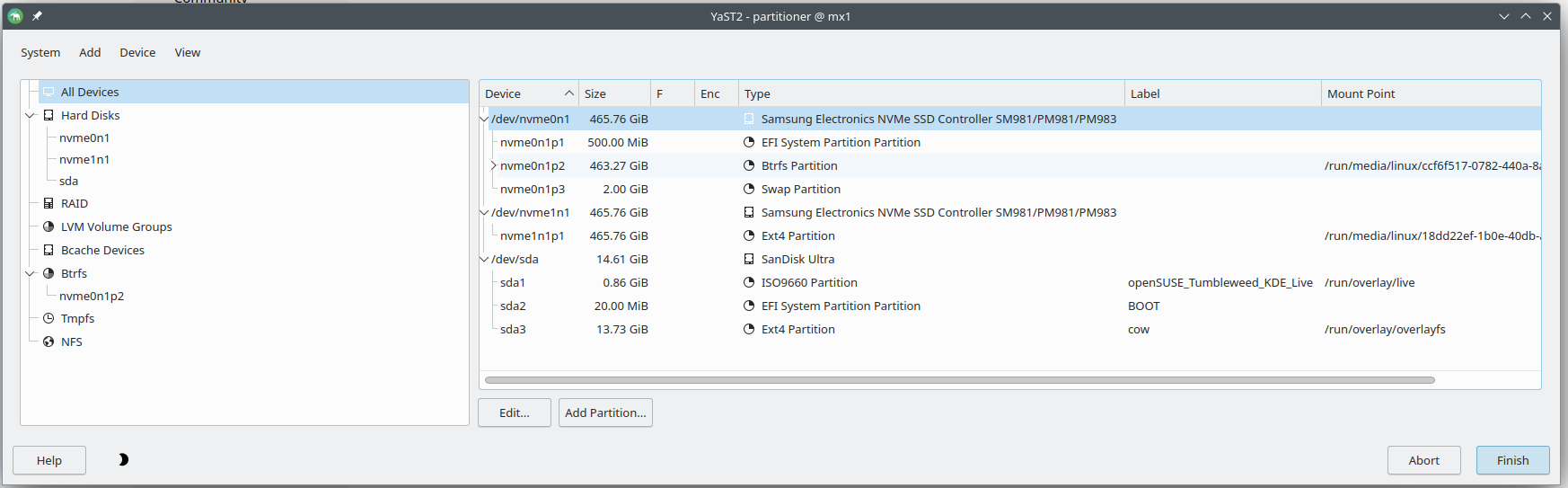 Check out my screenshot … that is a visual clue as to the naming structure of an NVME drive and its partitions. That screenshot shows TWO different NVME drives (there’s a 3rd sda drive too).