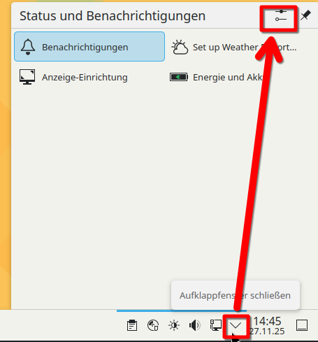 Wenn du einen Linksklick auf den kleinen Pfeil machst, öffnet sich das Status und Benachrichtigungsmenü, von welchem du ebenfalls zu den Einstellungen des Systemabschnitts gelangen kannst.