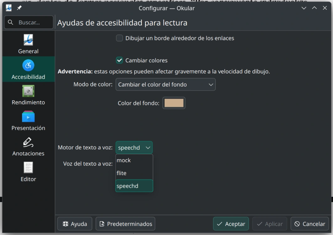 Calibre tiene la opción de leer texto a voz, permite reducir la velocidad de lectura y utilizar diferentes motores y voces.
