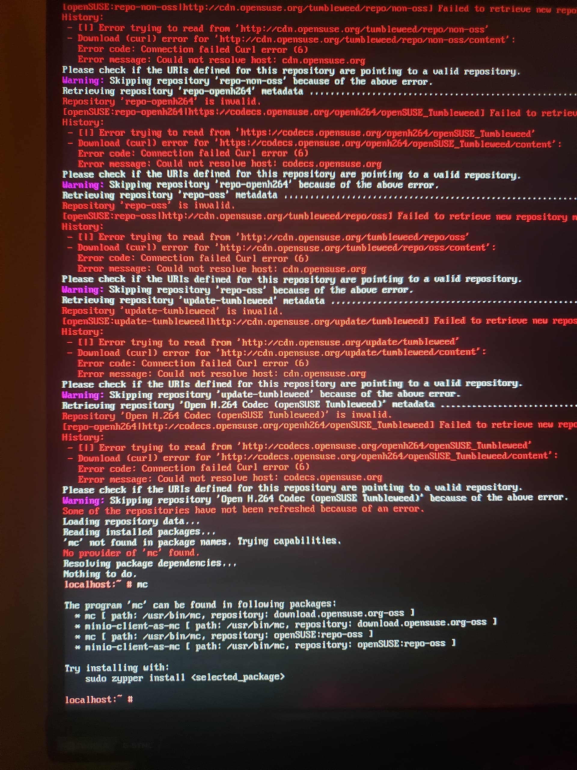 It looks like you do not have internet connection. Try zypper in mc again please to verify. It would be interesting to see if you can get connected to the internet in rescue mode.