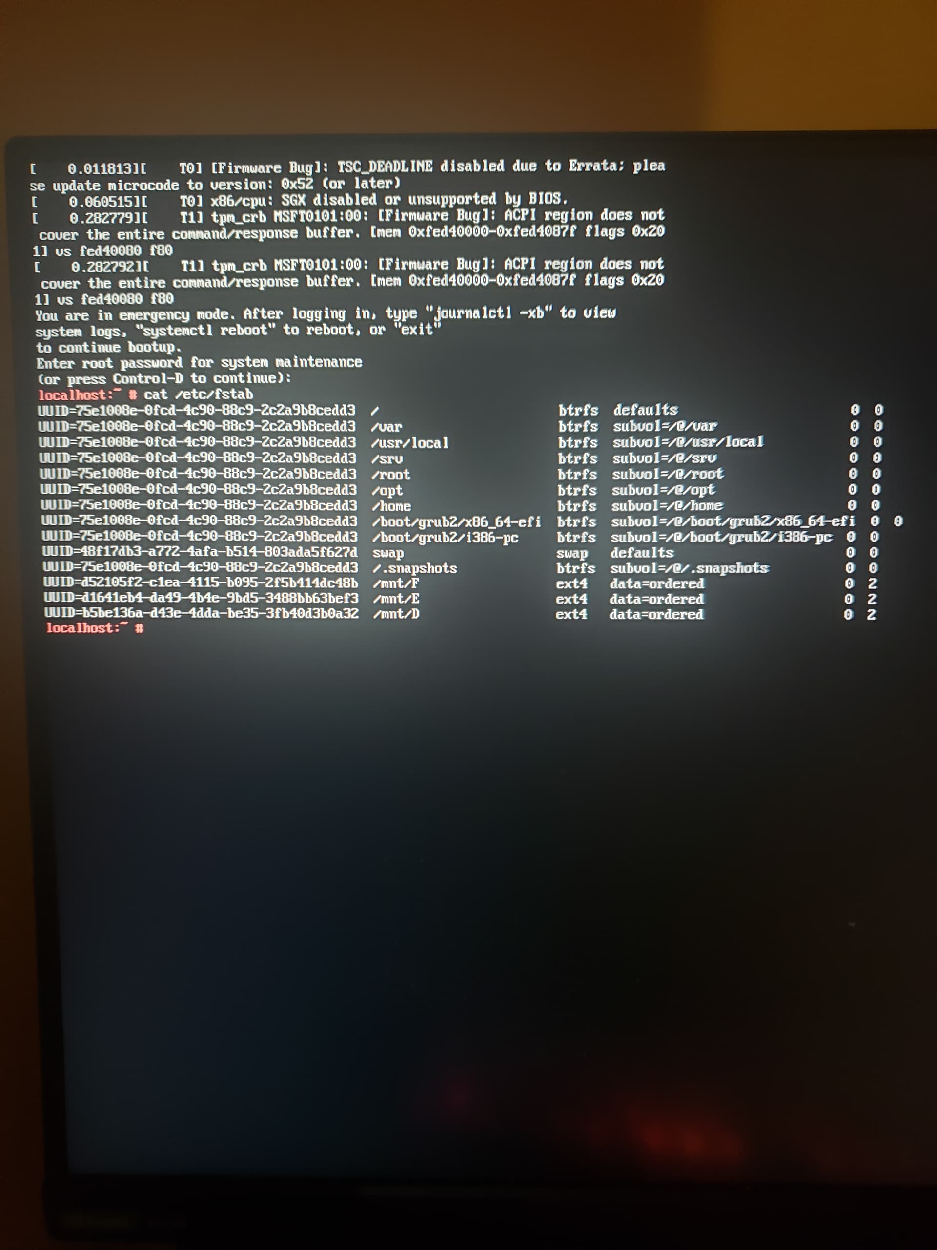 Traditionally, /mnt/ has been for temporary uses, so to me at least it doesnât make much sense to tie it up via /etc/fstab/ entries, so I never do. That youâre doing so may have absolutely nothing to do with your problem, but might it???