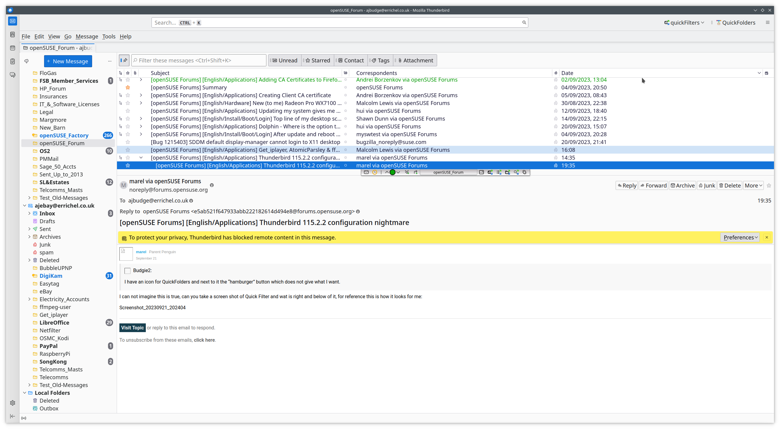 Running KDE desktop and trying to get to grips with the latest version of T’bird I am having real problems with the many changes but most significant are two changes I wish to reverse,