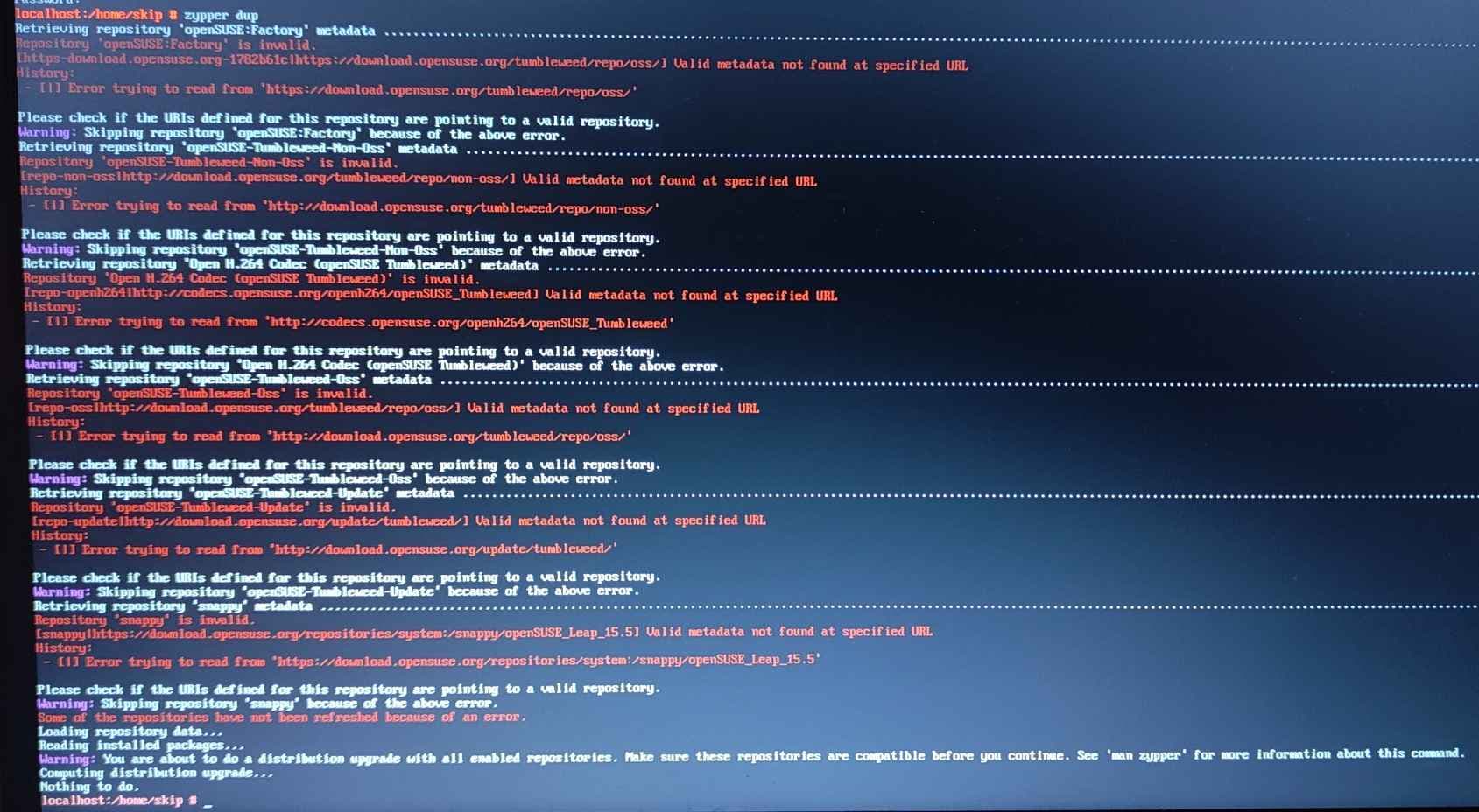 Attempting to re-perform a distro upgrade via sudo zypper dup leads to a wall of errors indicating all the repos have somehow become invalid (Factory, Tumbleweed-Oss, Tumbleweed-Non-Oss, Tumbleweed-Update included) with the same error message output for each individual repo: