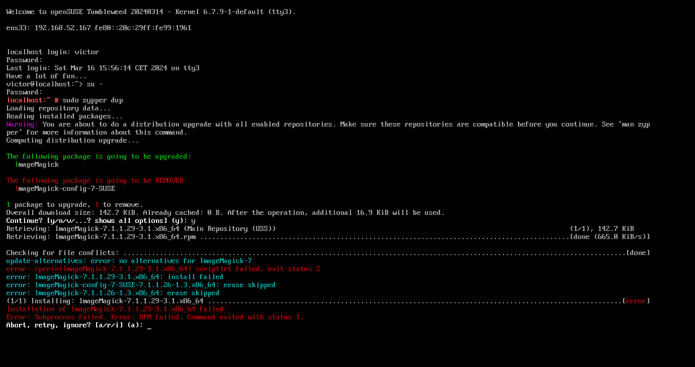 And on Tumbleweed NEVER use sudo zypper update but ONLY sudo zypper dist-upgrade or short sudo zypper dup
