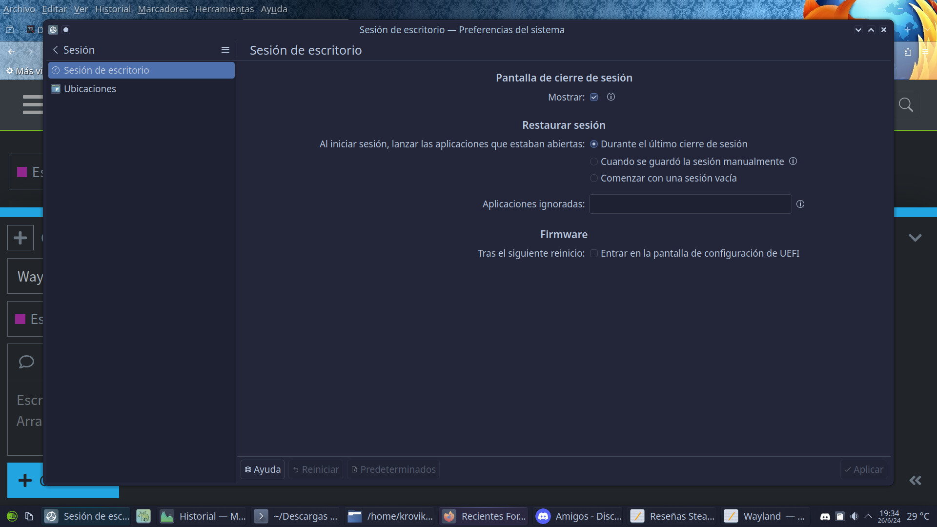Ya tenía un usuario Prueba cuando probé Wayland tras salir Plasma 6. Lo he iniciado y no es capaz de recordar nada (excepto Firefox, que cosa más rara) con las opciones tal cual (nada de grabar sesiones).