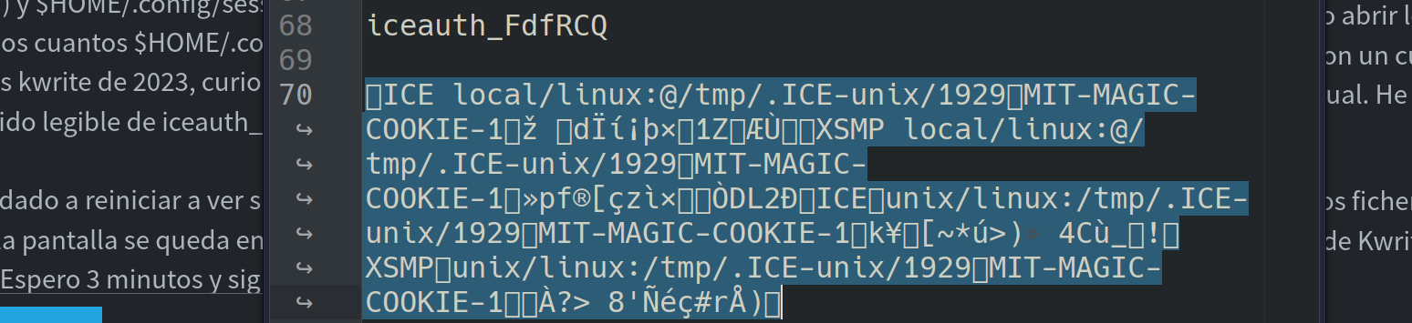Arranco en este modo y veo que los archivos de Kwrite no se habían abierto (que raro). Los abro en sus Kwrite en blanco, leo tu comentario y abro con Kwrite (sólo para hojear, sólo hice una copia del contenido de iceauth a un archivo de texto) los archivos /run/user/1000/iceauth_FdfRCQ, $HOME/.config/session/kdelastsession (o algo así) y $HOME/.config/session/kdelastsaved (o algo así). También ojeo unos cuantos $HOME/.config/session/kwriteloquesea (todo esos archivos kwrite de 2023, curioso).