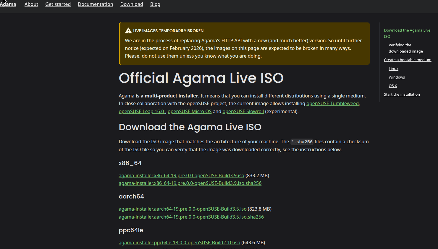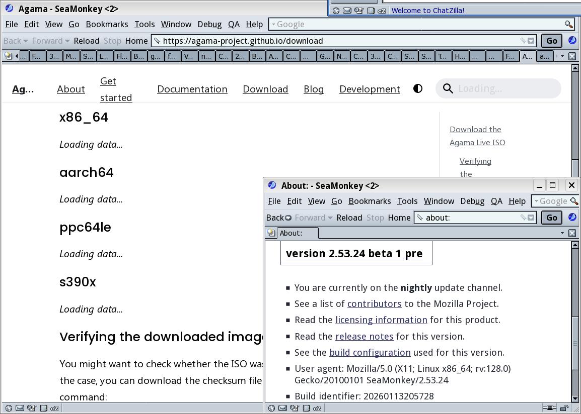I thought I saw a mailing list announcement of a fresh release of Agama within the past week or two, but don’t see it copied to announcements here, and I didn’t save it. https://agama-project.github.io/download doesn’t work in SeaMonkey much more than to say “Live images temporarily broken”. On d.o.o. there seems to be only two x86_64 to choose from by name, one labeled beta the other not, but with identical timestamps. Are these the same as the “broken” ones and/or each other? Mailing list search didn’t turn up anything looking like announcement I thought I saw. Where should I be looking to get the latest “release” of Agama that isn’t “broken” or alpha/beta/devel?