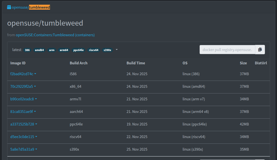 It was quite annoying, I had a bug that had recently been fixed a snapshot, but I was forced not to use registry.opensuse - one which I had configured and added explicitly, because I thought I did myself and others a favor by using the official registry and not further hogging docker hub