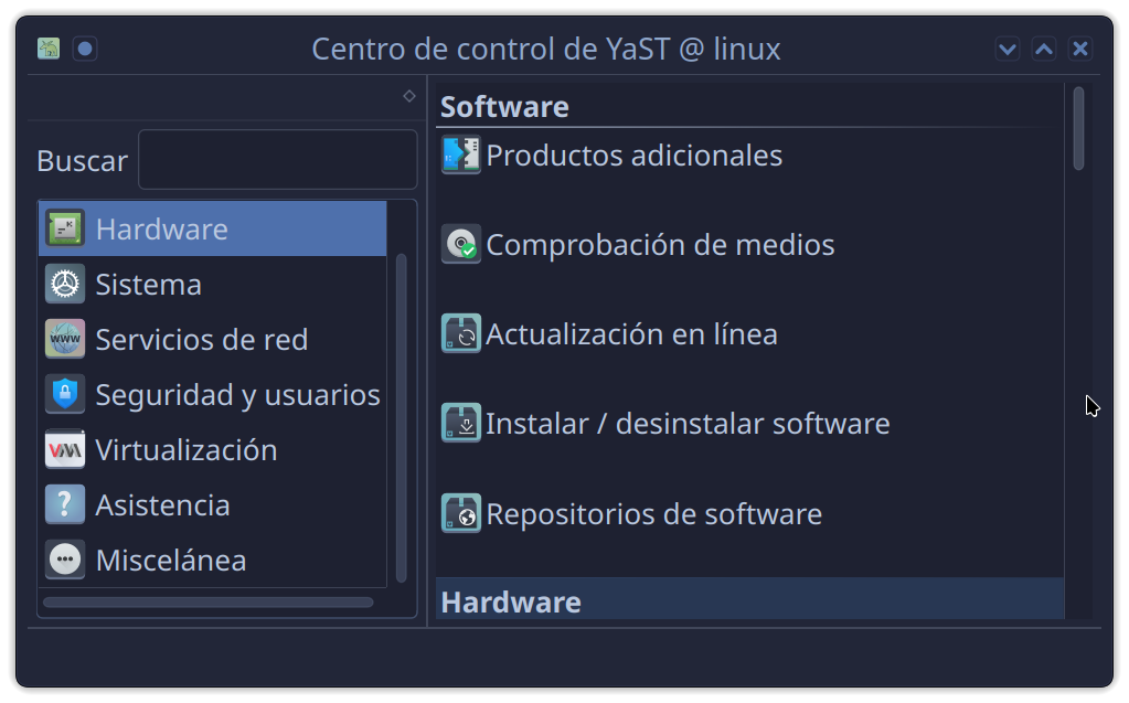 Propósito: Es una herramienta de configuración y administración integral para openSUSE. Permite gestionar casi todos los aspectos del sistema, desde la instalación y configuración inicial hasta la administración de paquetes, usuarios, redes, particiones, servicios del sistema y mucho más.