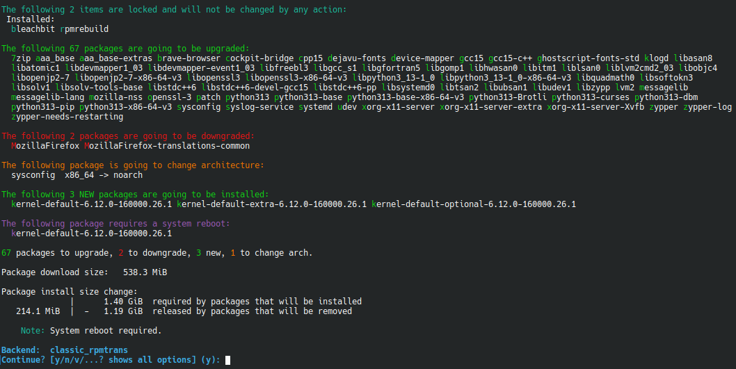 So just to clarify, I’m using Leap 16 / 6.12.0-160000.9-default - I’ve updated the system multiple times without issue, however, recently I did pushed for a flatpak update first and then I pushed for a whole system update i.e sudo zypper dup and it threw up multiple errors and it simply doesn’t complete install of updates as you’ll see in the screenshot provided below.