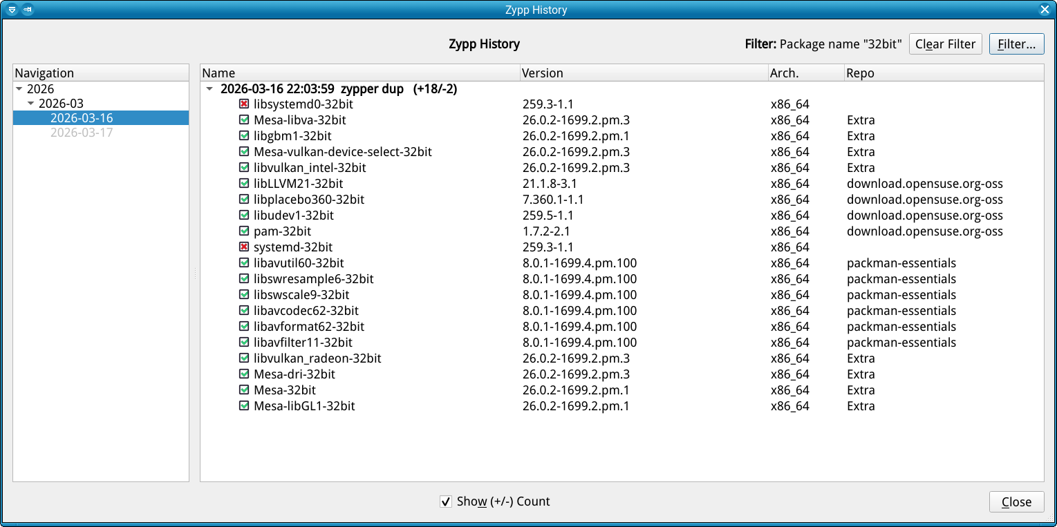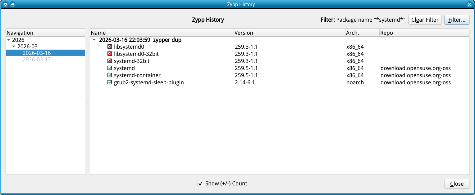 The last zypp history filtered for “systemd”: